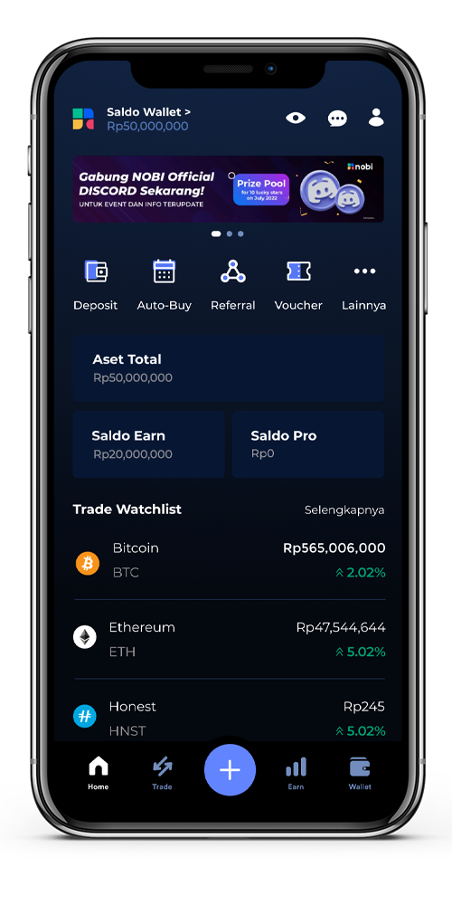 Di halaman ini, kamu bisa melihat section Trade Watchlist. Nah, untuk melihat semua list koin di NOBI dengan lengkap, tekan “Selengkapnya”. Atau cara simpel lainnya, kamu juga bisa langsung menekan menu ikon Trade.