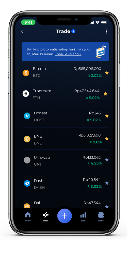 Di halaman ini, kamu bisa melihat section Trade Watchlist. Nah, untuk melihat semua list koin di NOBI dengan lengkap, tekan “Selengkapnya”. Atau cara simpel lainnya, kamu juga bisa langsung menekan menu ikon Trade.