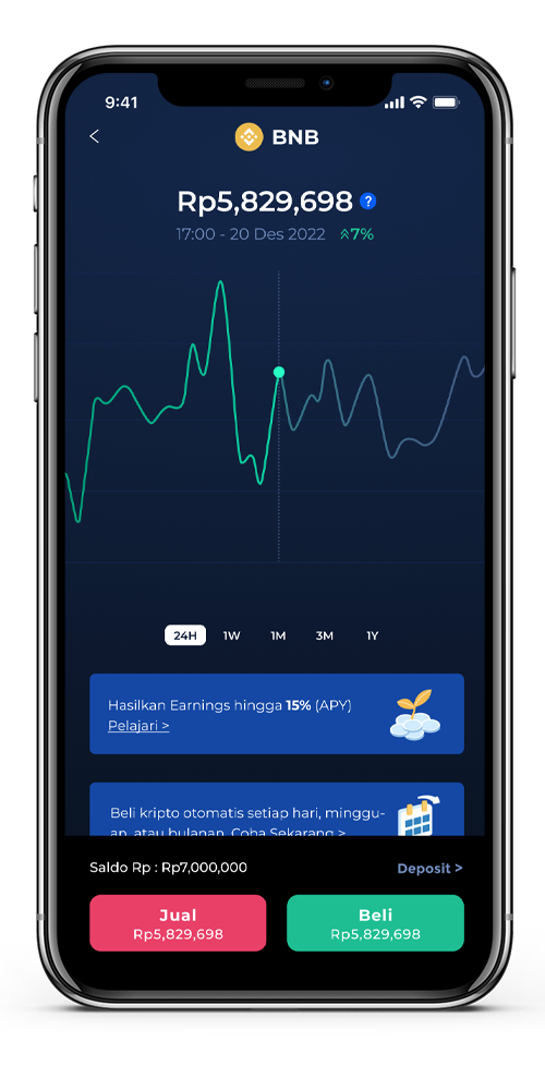 Di halaman koin, kamu dapat melihat chart pergerakan harga dari koin tersebut disertai detail terkait koin tersebut. Untuk melakukan pembelian, tekan tombol Beli di bagian bawah layar.