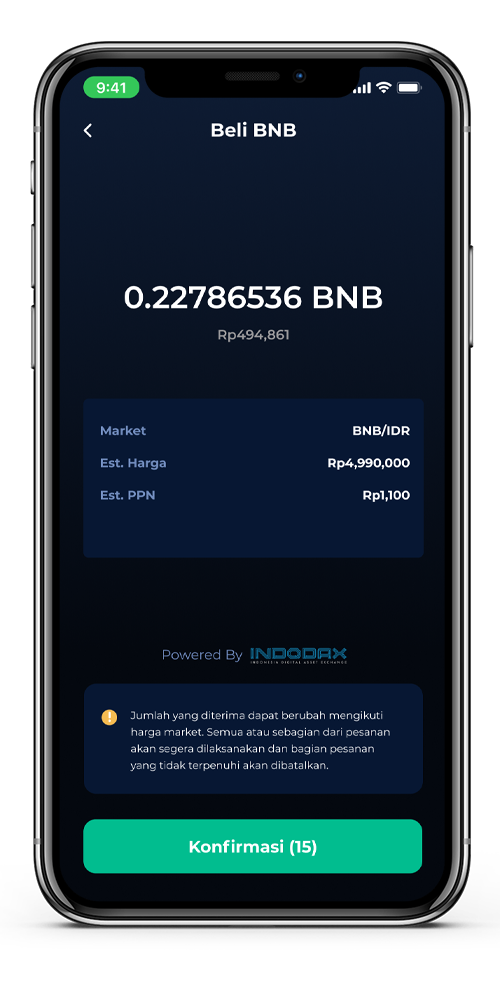 Berikutnya, kamu akan berpindah ke halaman konfirmasi di mana detail pembelian akan dicantumkan disana. Jika setuju dengan detail tersebut, silakan tekan tombol Konfirmasi. Mengingat harga aset kripto yang berubah-ubah, maka kamu diberi waktu untuk melakukan konfirmasi selama 20 detik. Setelah itu, harga dapat berubah mengikuti harga yang baru.